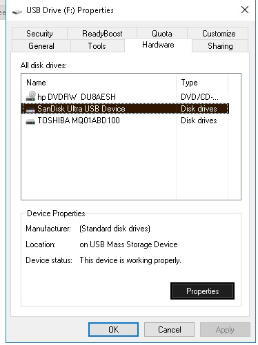 6. Select your drive in the list of drivers and click the Properties button.